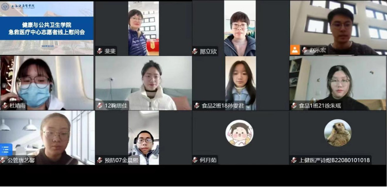 2023年1月19日下午1:30,为弘扬志愿服务精神,关心、关爱学院急救中心志愿者,健康与公共卫生学院组织线上120医疗急救中心志愿者线上慰问会,学院党总支书记顾斐雯、副院长那立欣出席,团总支书记赵乐宏主持,10位志愿者代表参会。