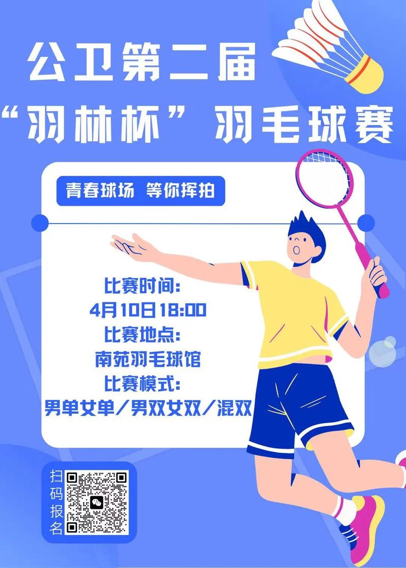 为全面提高学生体育素养,营造良好的运动氛围,增强学生体育锻炼意识、强健体魄,以更青春活力的姿态迎接本科教学评估。健康与公共卫生学院将于4月10日18:00 在南苑羽毛球馆举办2023年公卫学院第二届“羽林杯”羽毛球赛。