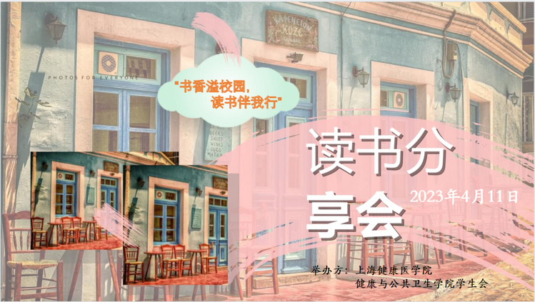 为营造学院阅读、思考及相互沟通的良好氛围,进一步推动学院文化建设,丰富学生课余生活,激发学生读书求知的热情,使学生养成热爱读书、热爱学习的习惯,健康与公共卫生学院于4月11日开展“书香溢校园,阅读伴我行”读书会活动。通过本次活动,营造“爱读书、想读书、会读书”的学习氛围,养成学生博览群书的习惯,使学生开阔视野,增长知识,发展智力,陶冶情操,分享好书,交流阅读所得,充实学生文化底蕴,促进学生思想上的健康发展。
