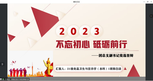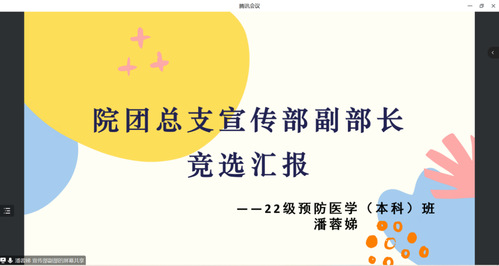 为保障健康与公共卫生学院团总支工作的连续性,培养一批新的学生干部,充分发挥部门职能,健康与公共卫生学院团总支于6月21日晚19:00线上开展学院团总支换届答辩工作。此次换届工作促进学院团总支工作的进一步发建设与发展,发挥学生骨干带头作用,促进各部门的经验交流,鼓励优秀学生的不断加入。