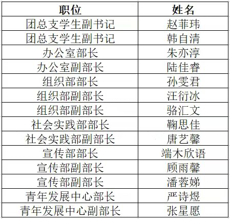 候选人竞选演说结束后,根据答辩表现和竞选人平时表现,对每一位选手进行了多方位评定与考察。经过综合考量与筛选,新任团总支干部名单如下:
