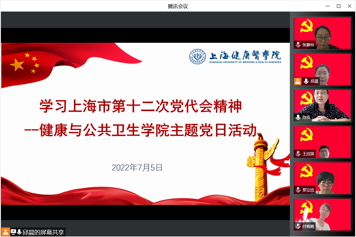2022年7月5日,健康与公共卫生学院党总支召开了主题党日活动,活动主题是深入学习领会上海市第十二次党代会精神。会议由陈泓书记主持,全体党员参加。