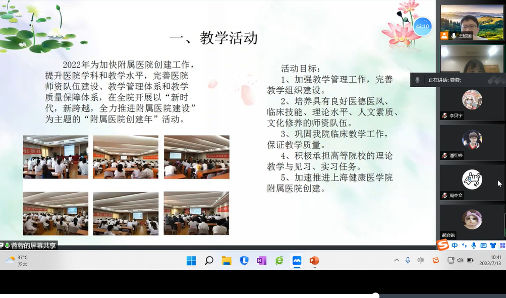 在教学管理方面,黄老师介绍了人员培训、人才计划申报、学科建设等。重点介绍了医院为加快上海健康医学院附属医院的创建工作,提升医院的学科和教学水平,完善师资队伍和教学管理体系,赫尔森康复医院自今年2月份起就开展了以“新时代新跨越,全面全力推进附属医院建设”为主题的附属医院创建年活动。医院成立教研室,着力培养一支具有良好临床技能、理论水平、人文素质和文化修养的师资队伍。